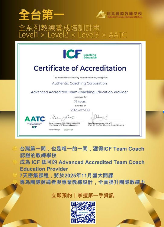 由達真國際教練學校領航Team Coach Certification 課程,榮獲 ICF AATC國際認證核可!這是對我們教學品質的肯定,更是教練職涯發展藍圖的關鍵拼圖。