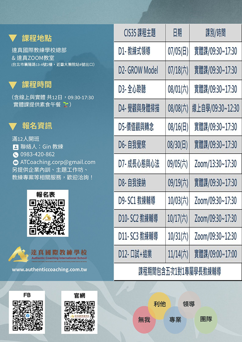 達真ICF Level1認證- ACC教練培訓35期,將於 2026/07/05 (日) 開班。